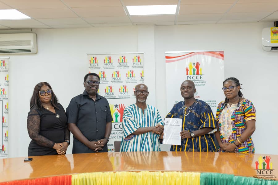 The National Commission for Civic Education (NCCE) has signed a Memorandum of Understanding with Parliamentary Network Africa (PNAfrica) to enhance collaboration in promoting civic engagement and open governance. The agreement was signed on behalf of NCCE by Deputy Chairman, General Services, Mr. Victor Brobbey, who chaired the meeting, alongside Deputy Chairman, Operations, Mr. Samuel Asare Akuamoah. PNAfrica was represented by its Executive Officer, Mr. Sammy Obeng, and Public Affairs Officer, Ms. Joana Oppong.